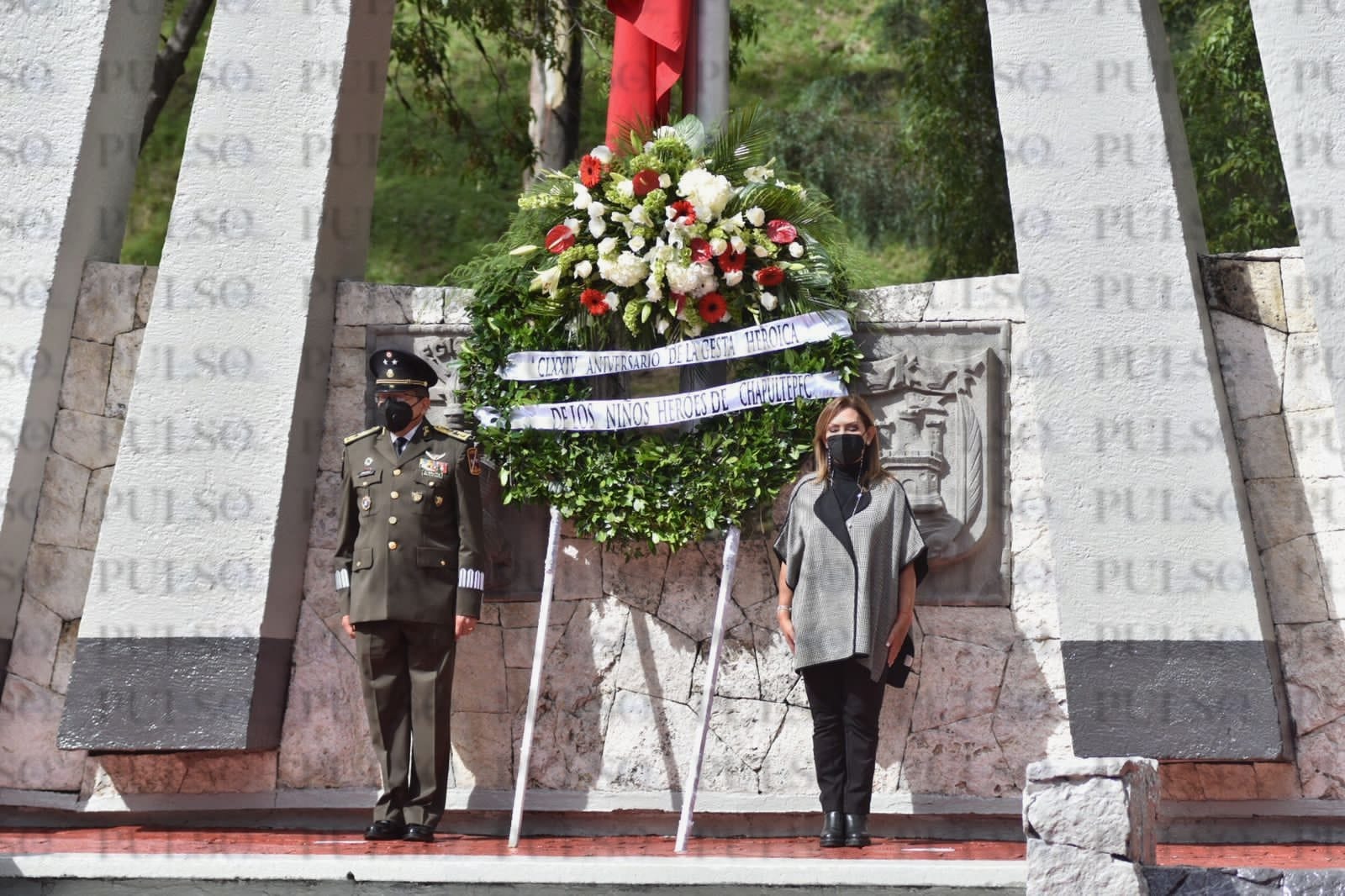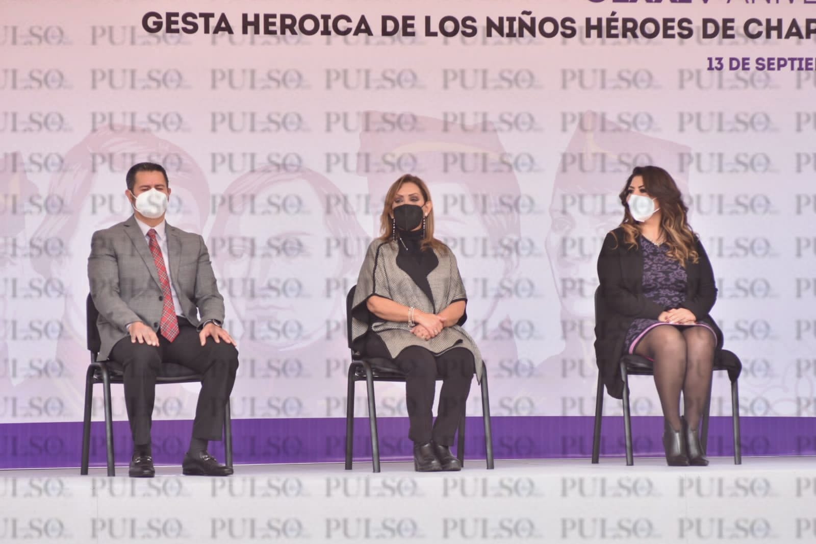 Tlaxcala, Tlax; 13 de septiembre de 2021 (Pulso) Esta mañana, la gobernadora del estado, Lorena Cuéllar Cisneros, celebró el aniversario de la gesta Heroica de los Niños Héroes, acompañada del General de Brigada José Joaquín Jiménez Cueto, Alejandra Ramírez Ortiz presidenta de la Mesa Directiva del Congreso del Estado y el alcalde de la capital Jorge Corichi Fragoso.