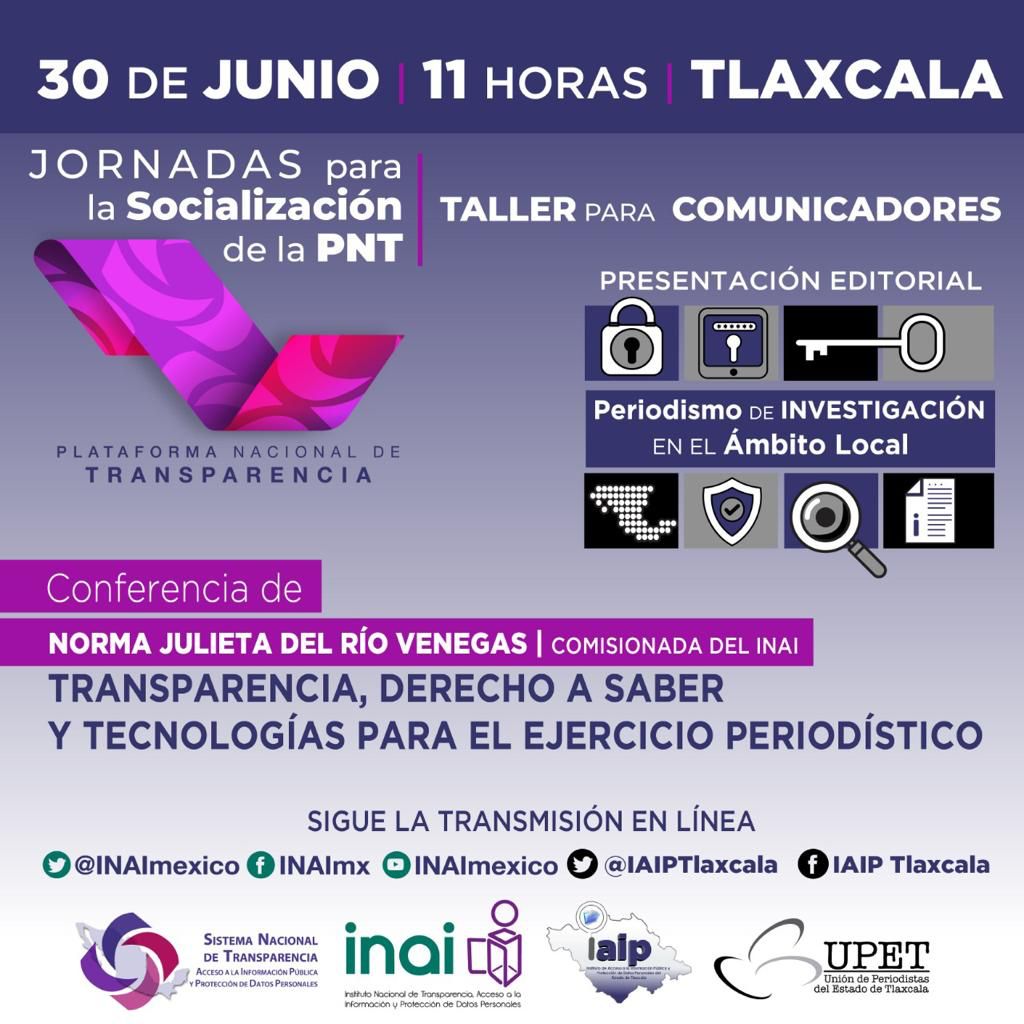 Con el respaldo del Instituto de Acceso a la Información Pública y Protección de Datos Personales del Estado de Tlaxcala (IAIP), este jueves 30 de junio, a las 11:00 horas, llevará a cabo un taller para comunicadores tlaxcaltecas en el Salón Apizaco del Hotel Posada, que forma parte de las Jornadas de Socialización de la Plataforma Nacional de Transparencia (PNT).