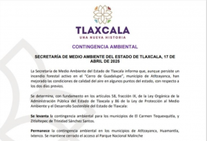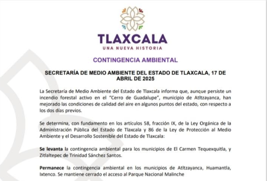 NOTA: Se continuará monitoreando permanentemente la calidad del aire con las estaciones de monitoreo, así como analizando la información generada, por lo que a primera hora del día de mañana se determinará si se levanta la contingencia ambiental, así como si se apertura el acceso al Parque Nacional Malinche.