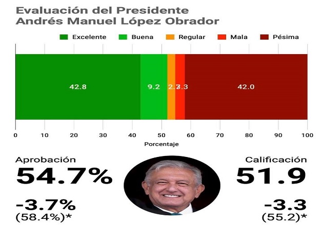 Asimismo, la aprobación del Presidente de la República, Andrés Manuel López Obrador bajó 3.7 por ciento, llegando a 54.7 por ciento de aprobación y consideraron que la economía es el principal problema del país.