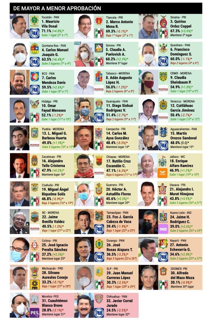 En el primer lugar, se encuentra el gobernador de Yucatán, Mauricio Vila Dosal del Partido Acción Nacional (PAN) con 71.1 por ciento, tras aumentar 4.8 puntos porcentuales de aprobación.
