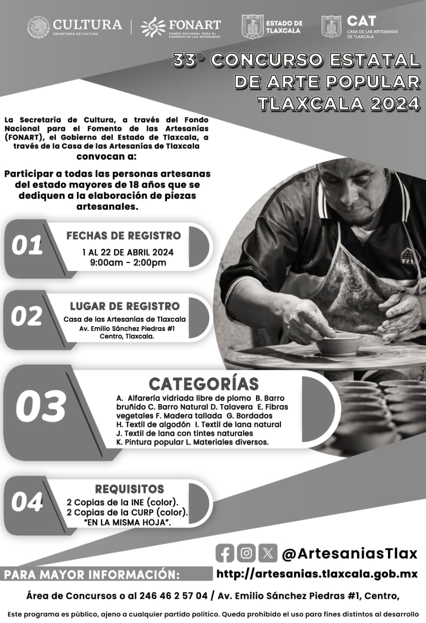 Tlaxcala, Tlax; 01 de abril de 2024 (PulsoRed) La Casa de las Artesanías de Tlaxcala (CAT) invita a los artesanos del estado a participar en el XXXIII Concurso Estatal de Arte Popular Tlaxcala 2024.