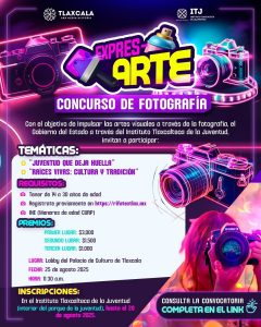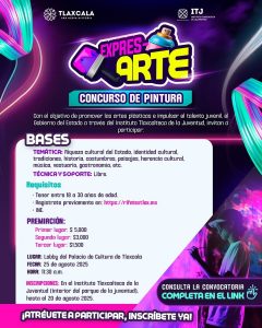 Tlaxcala, Tlax; 24 de julio de 2025 (PulsoRed) El Instituto Tlaxcalteca de la Juventud (ITJ) lanzó la convocatoria para los concursos de pintura y fotografía “Expres-Arte”, dirigido a jóvenes de entre 14 y 30 años que deseen expresar, a través del arte, la riqueza cultural del estado y fortalecer su identidad mediante la creatividad visual.