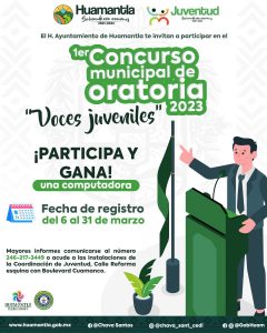 Huamantla, Tlax; 10 de marzo de 2023 (PulsoRed) El Gobierno Municipal de Huamantla que preside Salvador Santos Cedillo, a través de la Coordinación de Juventud convoca a las y los jóvenes de nivel secundaria y bachillerato a participar en el Primer Concurso Municipal de Oratoria “Voces juveniles 2023”, que se llevará a cabo el 7 de abril en el Museo Nacional del Títere (Munati).