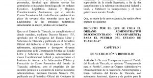 Tlaxcala, Tlax; 02 de octubre de 2025 (David Rodríguez) El gobierno del estado publicó este miércoles el decreto por el que se crea “Transparencia para el Pueblo de Tlaxcala”, un órgano administrativo desconcentrado de la Secretaría Anticorrupción y Buen Gobierno de Tlaxcala.