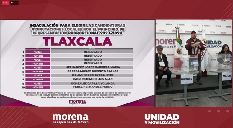 Tlaxcala, Tlax; 18 de marzo de 2024 (PulsoRed) Supuestamente con el alegato de dar cumplimiento al Mandato de Ley y la Estrategia Política, Movimiento Regeneración Nacional (MORENA) llevó a cabo el proceso de insaculación para las designaciones de candidaturas a las diputaciones locales por el principio de representación proporcional, dejando en reserva las cuatro primeras.