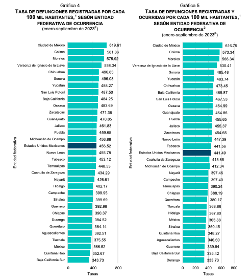 En contraparte, las entidades con las tasas de defunciones más alta del país se registraron en la Ciudad de México (CDMX) con 619.61 fallecimientos por cada 100 mil habitantes, seguido por Colima con 581.86, Morelos con 575.92, Veracruz con 538.34 y Chihuahua con 496.83.