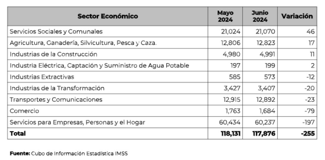 Para el 31 de mayo de 2024, la cifra de trabajadores asegurados ascendía a 118 mil 131, sin embargo, dicha cantidad bajó a los 117 mil 876 registrados por el instituto, perdiendo los 255 puestos con seguridad social mencionados con antelación.