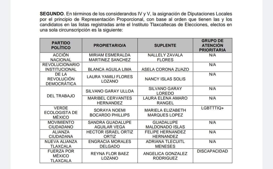 Así como Sandra Guadalupe Aguilar Vega, de Movimiento Ciudadano (MC); Héctor Israel Ortiz Ortiz, del Partido Alianza Ciudadana (PAC); Engracia Morales Delgado, del Partido Nueva Alianza Tlaxcala (PANALT); y Rayna Flor Baez Lozano, de Fuerza por México (FxM) Tlaxcala.