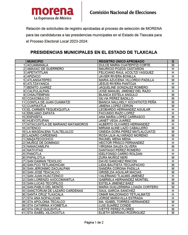 Tlaxcala, Tlax; 02 de abril de 2024 (Selene Sosa) En la lista oficial de Movimiento Regeneración Nacional (MORENA) de candidatas y candidatos a las 60 presidencias municipales de Tlaxcala, destacaron los nombres de funcionarios del Gobierno de Lorena Cuéllar Cisneros y de diputadas quienes solicitaron licencia al cargo.