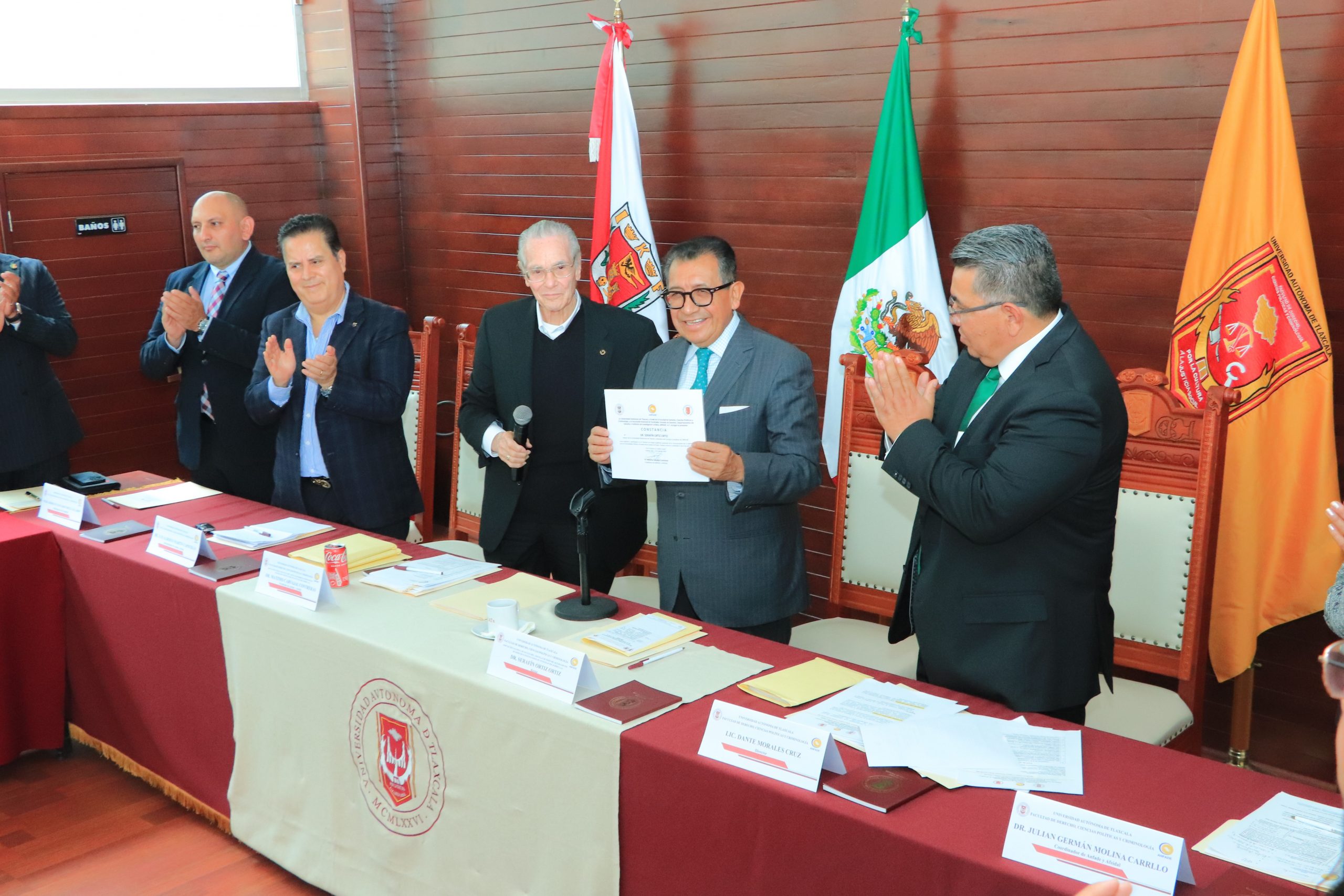 Previo a inaugurar los trabajos de dicha reunión, el Doctor Serafín Ortiz Ortiz, Rector de la UATx, recibió en la Sala de Juntas de la Rectoría al Doctor Máximo Carvajal Contreras, Presidente de ANFADE, con quien abordó asuntos relacionados con la Ciencia Jurídica y la formación académica de los futuros profesionistas en Derecho.