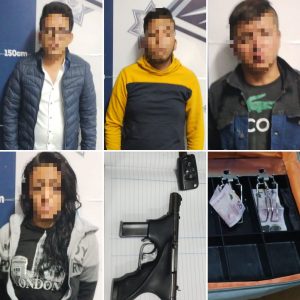 Apizaco, Tlax; 18 de septiembre de 2022 (PulsoRed) La policía de Apizaco tomó conocimiento de un asalto en una tienda de conveniencia por lo que de inmediato se trasladaron al lugar donde aseguraron a tres masculinos, una femenina, un arma de fuego calibre 22, charola de la caja registradora con dinero y un vehículo.