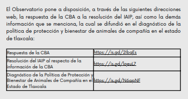 Vía Plataforma Nacional de Transparencia (PNT), el OCPA solicitó a la Coordinación de Protección Animal conocer dicha información, sin embargo, fueron omisos al respecto, por lo que la asociación civil presentó un recurso de revisión ante el Instituto de Acceso a la Información Pública y Protección de Datos Personales (IAIP) Tlaxcala.