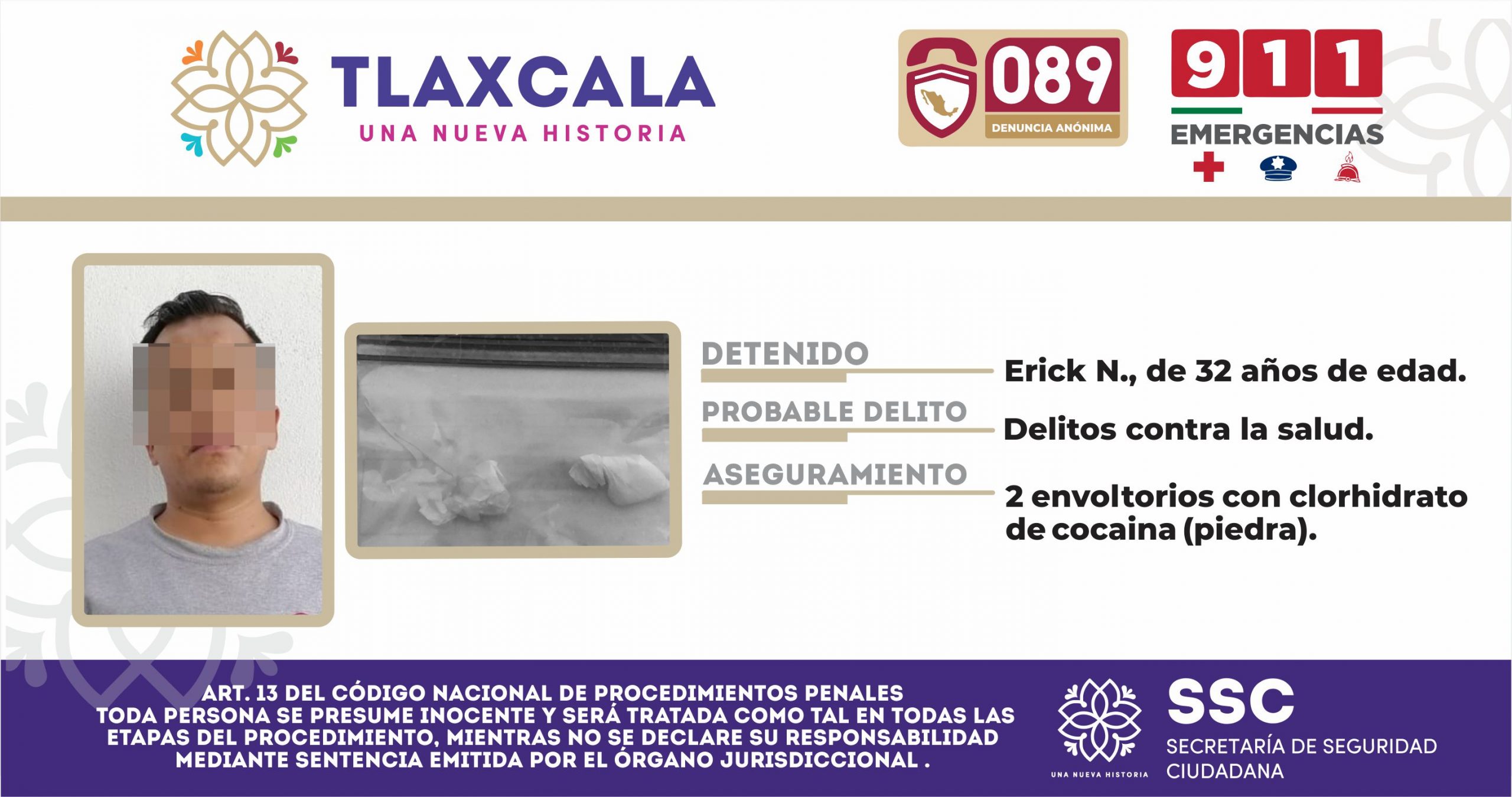 Tlaxcala, Tlax; 2 de diciembre de 2021 (Pulso Red) La Secretaría de Seguridad Ciudadana (SSC) a través de acciones permanentes para la prevención y combate de los delitos en el estado, detuvo el día miércoles en el municipio de Chiautempan a una persona; presunta responsable de cometer delitos contra la salud en su modalidad de narcomenudeo.