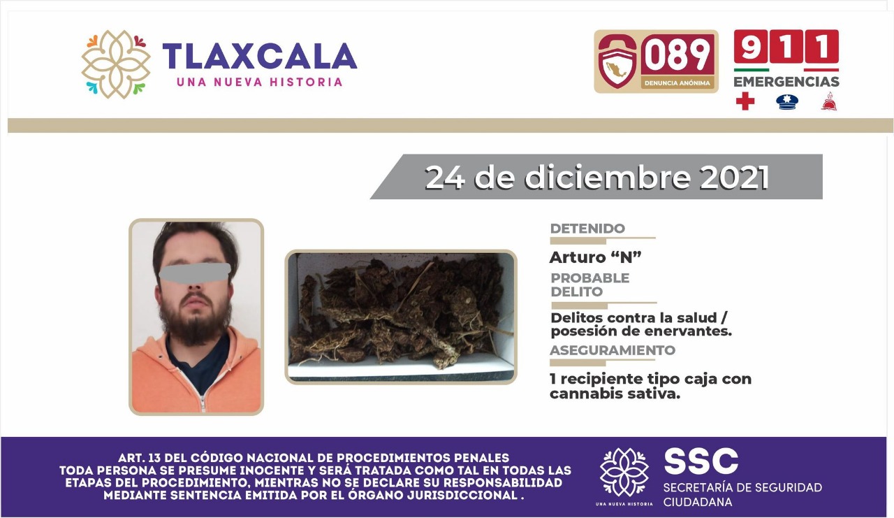 Tlaxcala, Tlax; 26 de diciembre de 2021 (Pulso Red) La Secretaría de Seguridad Ciudadana (SSC) detuvo en el municipio de Tlaxco a un sujeto, presunto responsable de cometer delitos contra la salud en su modalidad de narcomenudeo.