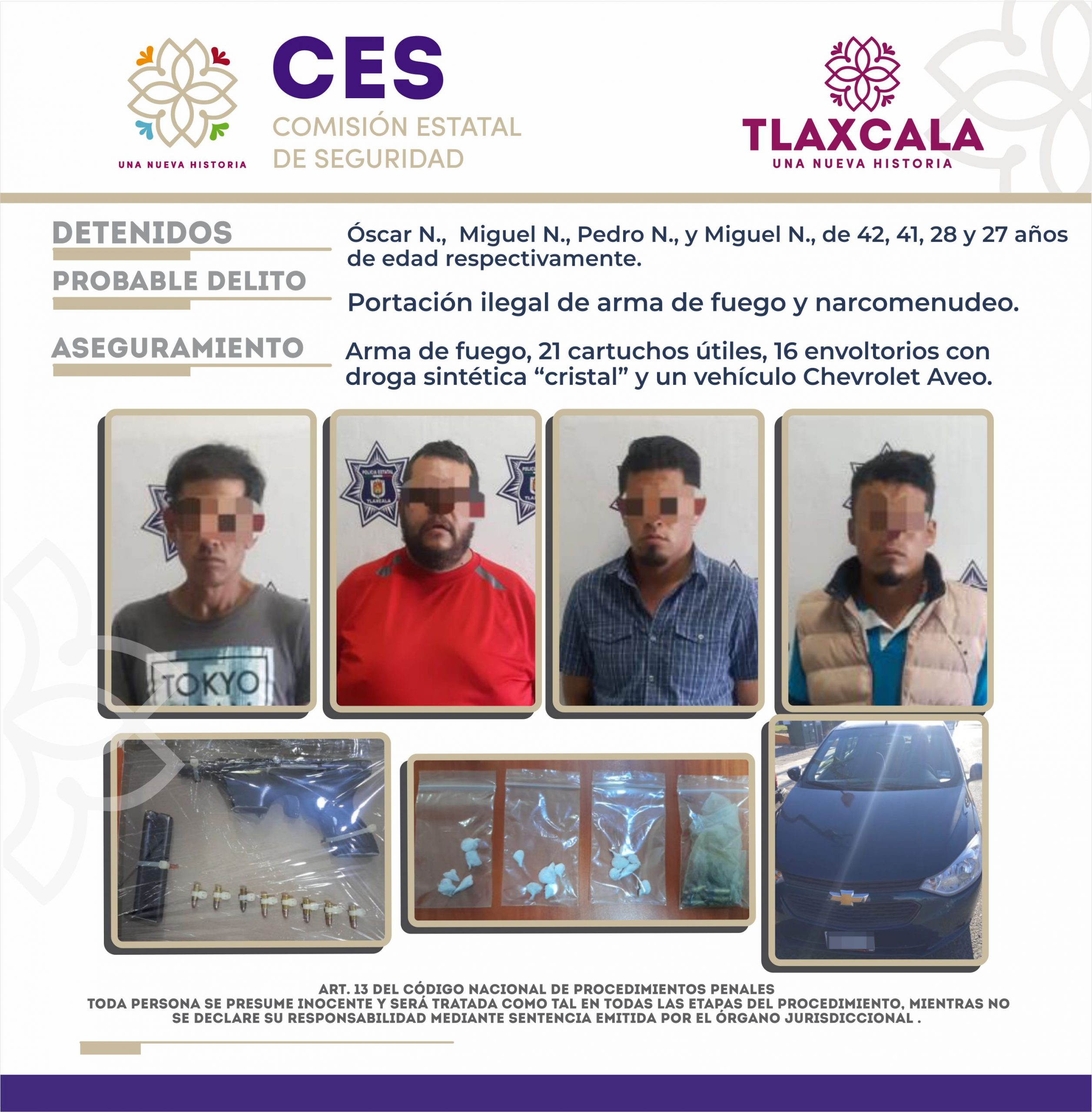 Siendo un hecho constitutivo de delito, ya que; los sujetos identificados como Miguel N., Pedro N., Miguel N., y Oscar N., de 41, 28, 27 y 42 años de edad, respectivamente, fueron detenidos tras no contar con documento alguno que acreditara de manera legal la posesión y portación de arma de fuego y por el probable delito de daños contra la salud en su modalidad de narcomenudeo.