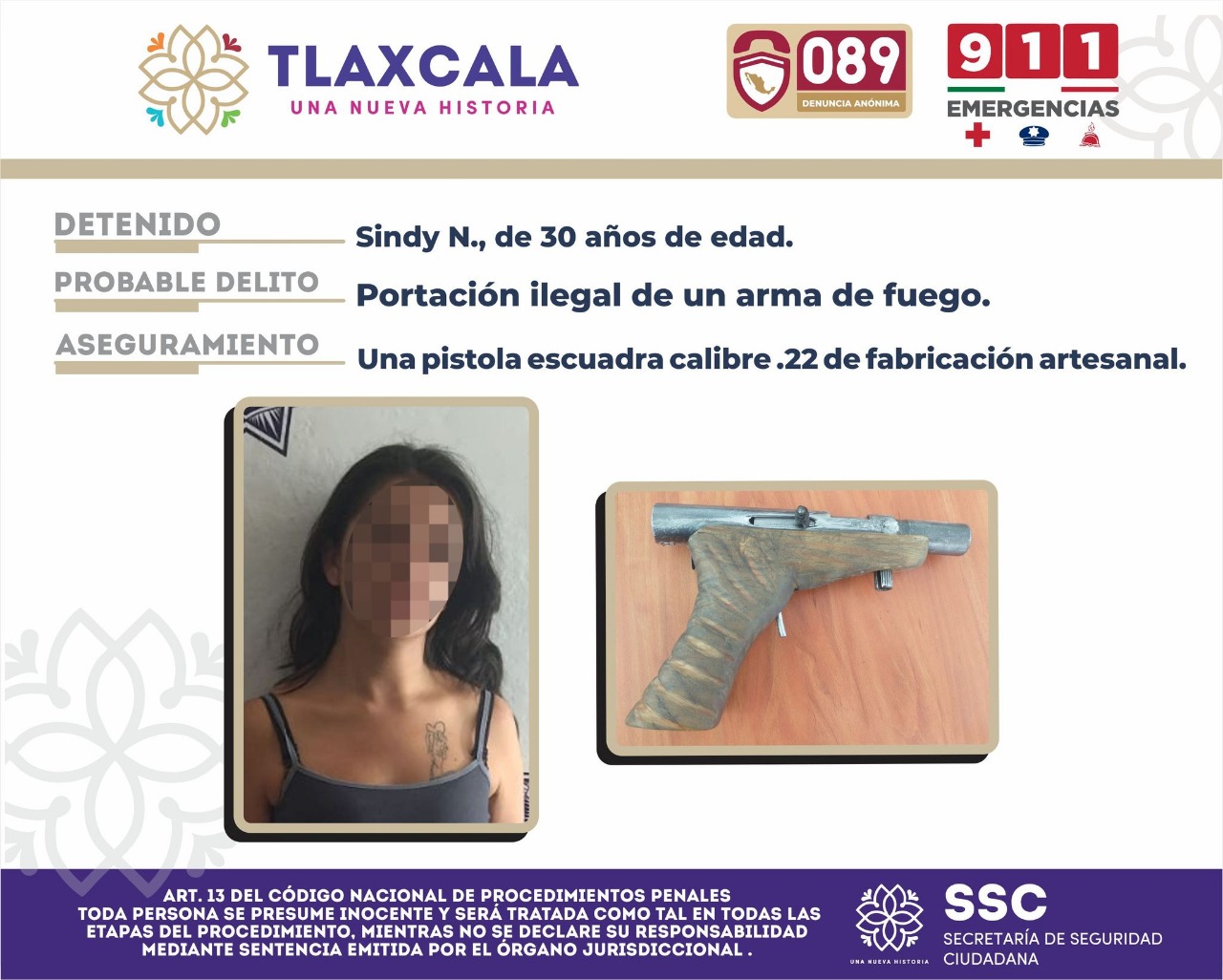 Tlaxcala, Tlax; 3 de diciembre de 2021 (Pulso Red)  La Secretaría de Seguridad Ciudadana (SSC) mediante acciones permanentes enfocadas a la prevención y combate de los delitos en el estado de Tlaxcala, detuvo en el municipio de Apizaco a una mujer, la cual se presume que cometió el delito de portación ilegal de arma de fuego.