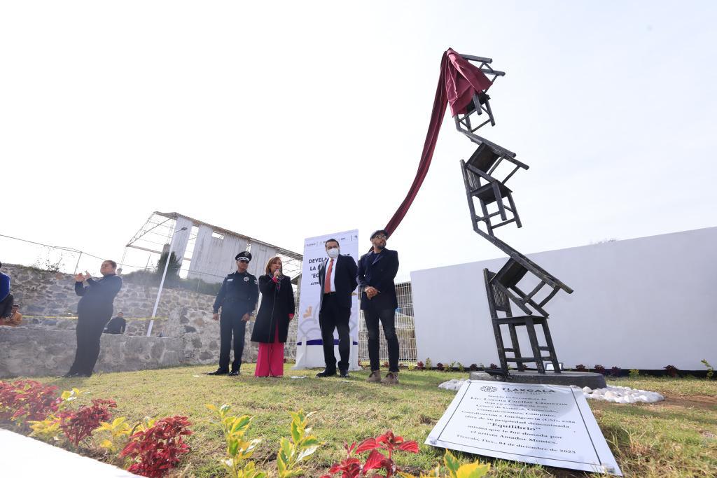 Tlaxcala, Tlax; 05 de diciembre de 2023 (PulsoRed) La gobernadora de Tlaxcala, Lorena Cuéllar Cisneros, develó la escultura “Equilibrio” del artista Amador Montes, en las instalaciones del Centro de Control, Comando, Comunicaciones, Cómputo, Coordinación e Inteligencia (C5i), como parte de las acciones para conjuntar el arte con la seguridad y prevención del delito.