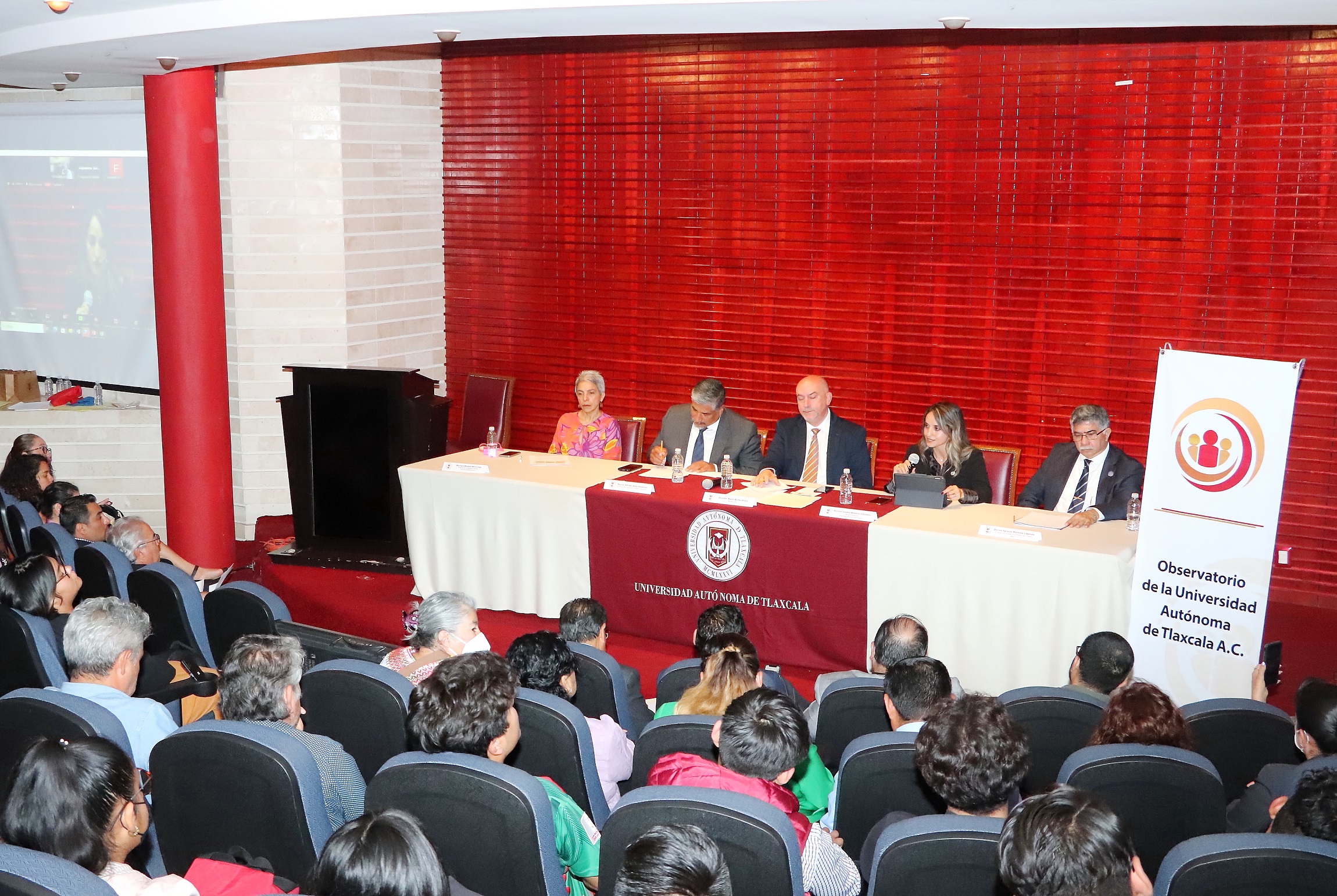 De igual forma, la Doctora Yesenia Mendoza Villalobos, Jefa de Investigación de la Universidad Autónoma de Chihuahua (UACh); y el Doctor Alfredo Adán Pimentel, Secretario de Investigación Científica y Posgrado de la UATx, fungiendo como moderador el Doctor Raúl Ávila Ortiz, Coordinador General del Staff de Rectoría.