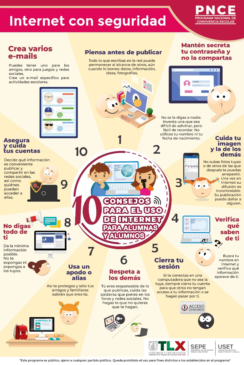 Tlaxcala, Tlax; 23 de febrero de 2021 (Pulso) La Secretaría de Educación Pública del Estado (SEPE) y la Unidad de Servicios Educativos de Tlaxcala (USET), promueven en sus redes sociales oficiales 10 consejos para alumnas y alumnos mientras navegan en la web.
