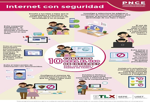 Tlaxcala, Tlax; 11 de febrero de 2021 (Pulso) La Secretaría de Educación Pública del Estado (SEPE) y la Unidad de Servicios Educativos del Estado de Tlaxcala (USET), difunden a través de sus redes sociales Institucionales, “10 Consejos para el Uso de Internet Para las Madres y Padres de Familia”, con el objetivo de que los alumnos naveguen de forma responsable y segura.