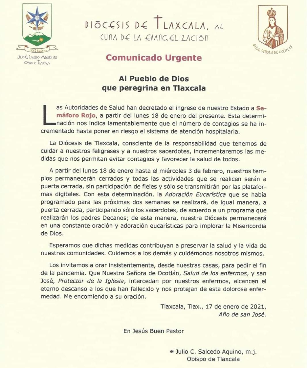 Anunció que a partir de este lunes 18 de enero y hasta el próximo miércoles 3 de febrero, los templos permanecerán cerrados y todas las actividades que se realicen serán a puerta cerrada, sin participación de fieles y solo se transmitirán por las plataformas digitales, además de que la adoración Eucarística de igual manera será a puerta cerrada.