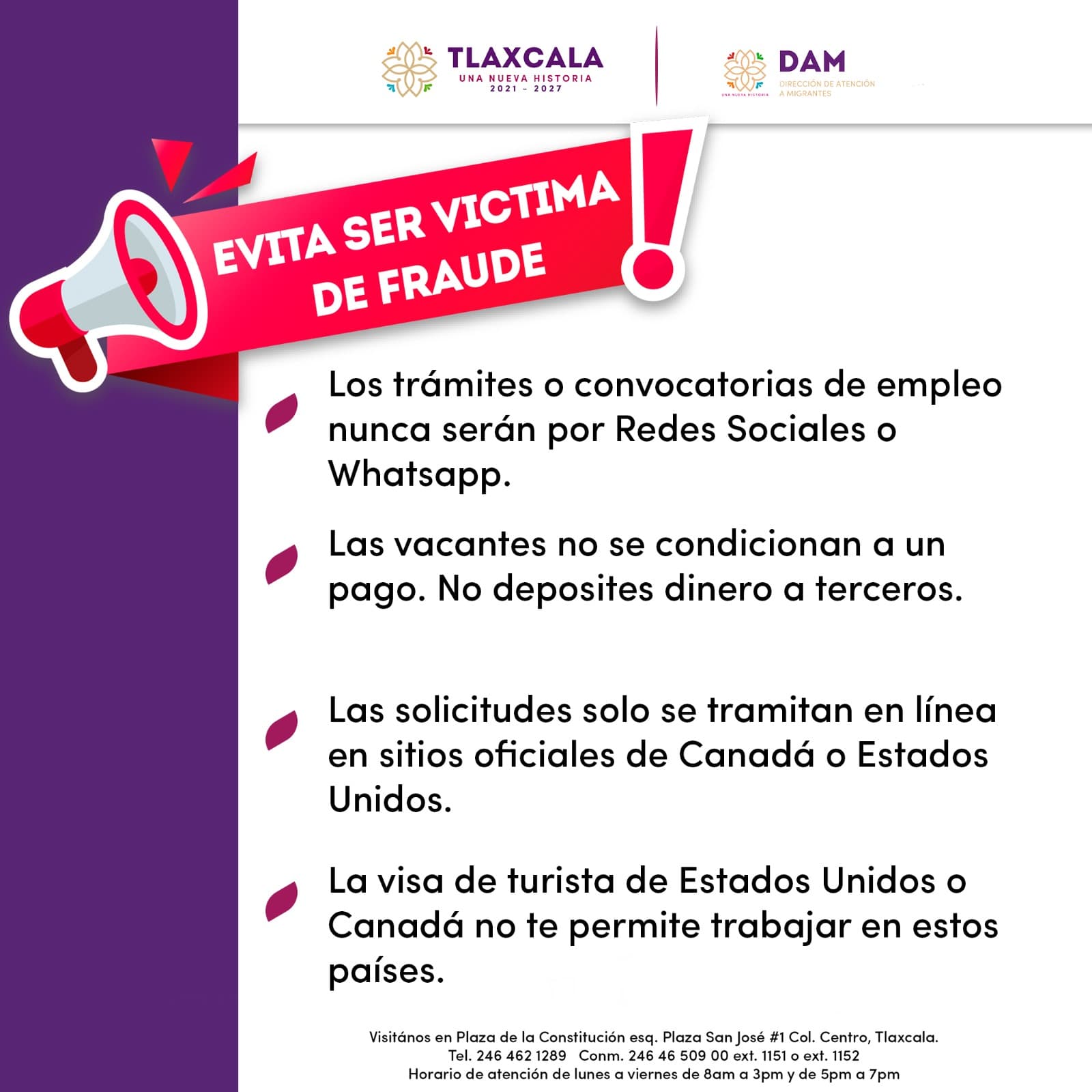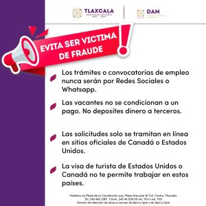 Tlaxcala, Tlax; 09 de febrero de 2025 (PulsoRed) La Dirección de Atención a Migrantes (DAM), informa a la ciudadanía tlaxcalteca que los trámites de pasaportes mexicano y americano, visa americana o canadiense, doble nacionalidad, empleo temporal, entre otros, solo se deben hacer en instituciones gubernamentales oficiales, los cuales son gratuitos; a fin de evitar que sean víctimas de fraudes cibernéticos.