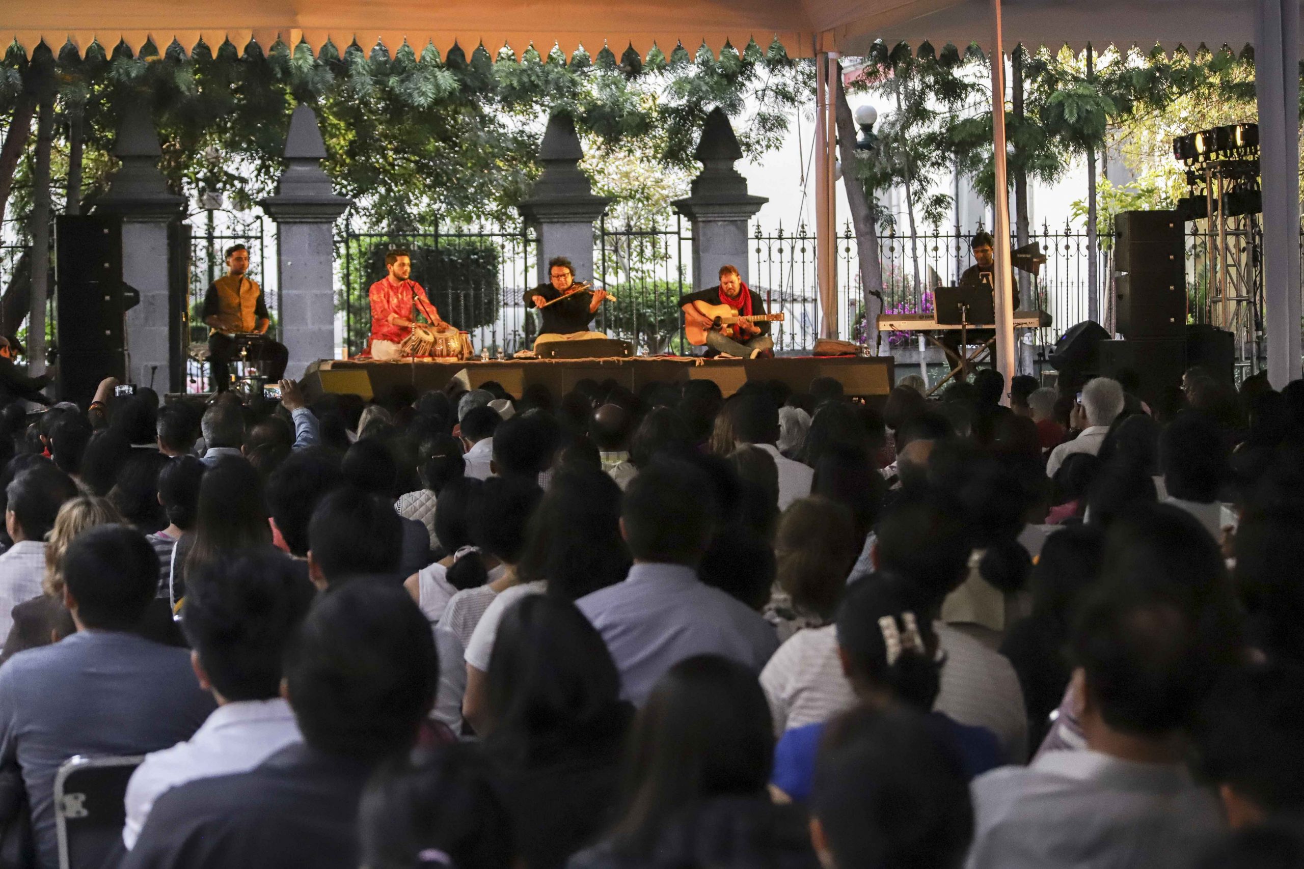 Minutos después de las seis de la tarde inició la presentación de Deepak Pandit, quien aprendió los trabajos vocales y la instrumentación del hindustani, uno de los dos principales tipos de música clásica del sur de Asia, acompañado por Raaga Fusion, agrupación contemporánea con influencias indias y occidentales.