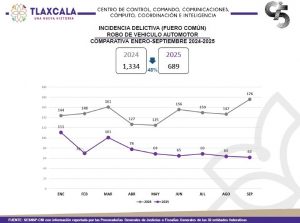 Tlaxcala, Tlax; 31 de octubre de 2025 (PulsoRed) Como resultado de las acciones emprendidas en el marco de la estrategia estatal de seguridad pública, Tlaxcala registró una disminución de 48% en la incidencia de robo de vehículo automotor.