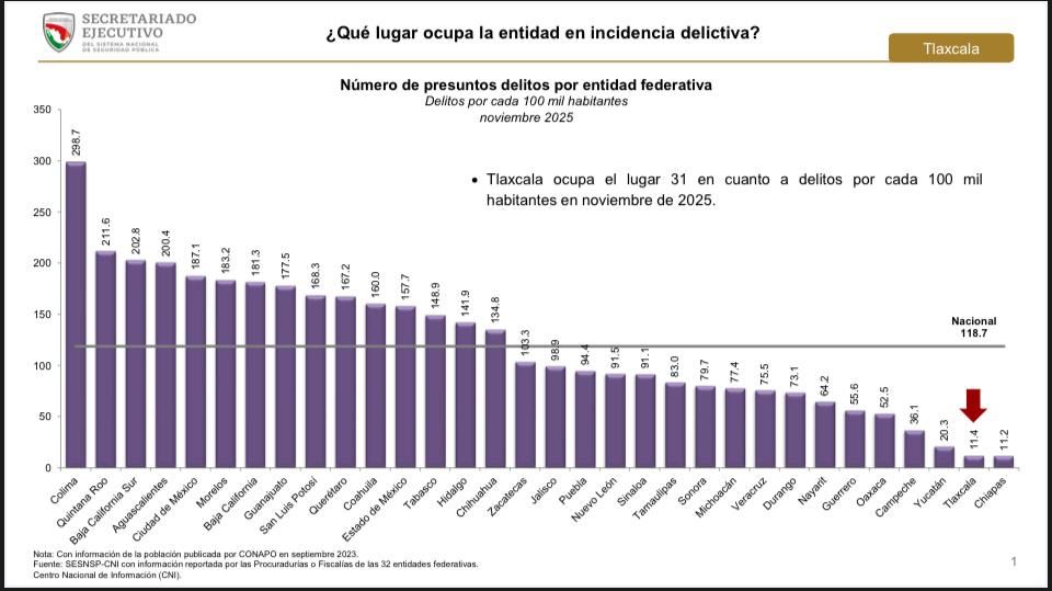 Mientras, al comparar de enero a noviembre de 2025, Tlaxcala se ubica en el sitio 32, con el menor número de delitos de todo el país, con 161.5.