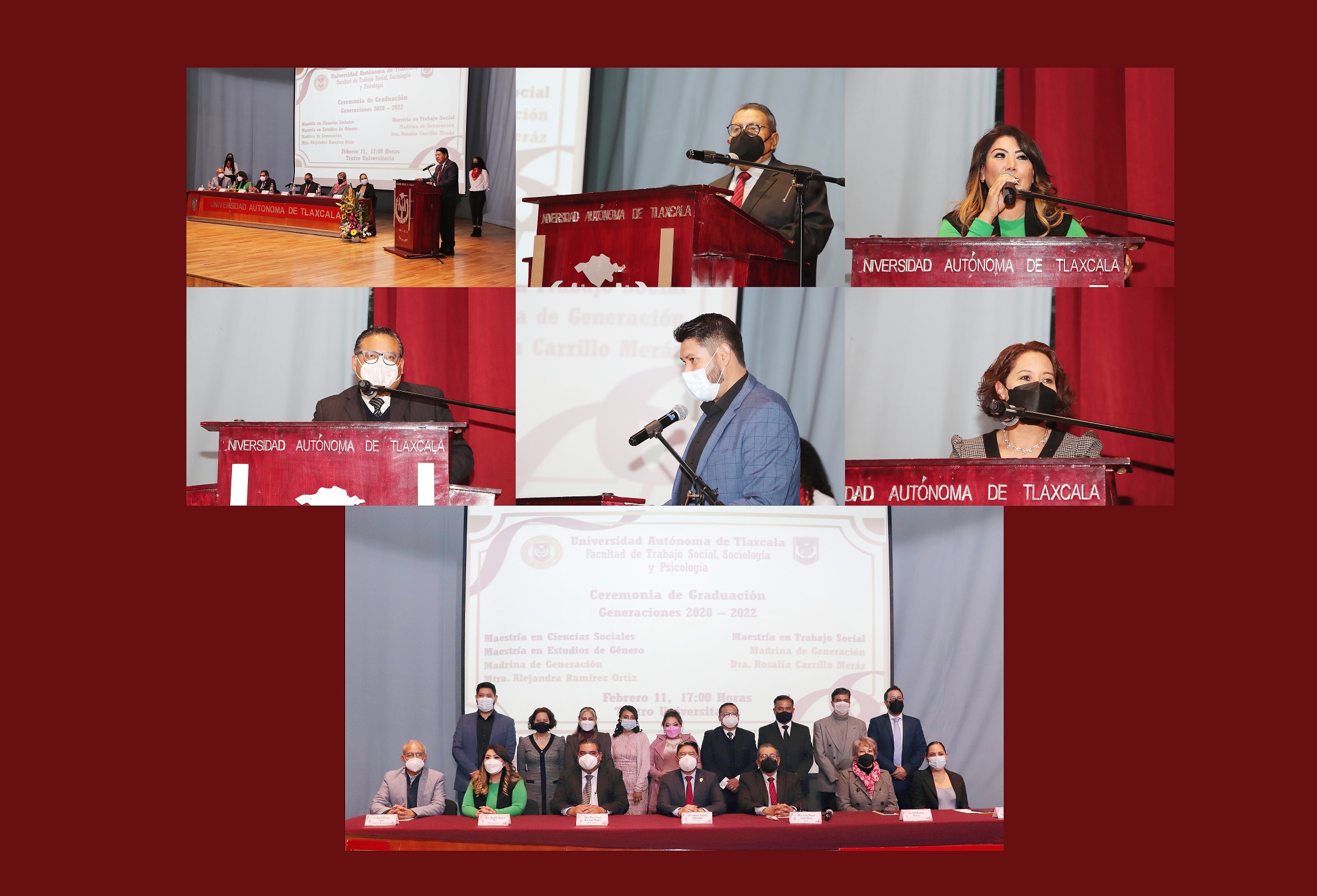 Tlaxcala, Tlax; 18 de febrero de 2022 (PulsoRed) El quehacer de las Instituciones de Educación Superior (IES), es egresar seres humanos dispuestos a comprometerse con su sociedad, en este sentido, la Universidad Autónoma de Tlaxcala (UATx), a través de la Facultad de Trabajo Social, Sociología y Psicología, llevó a cabo la ceremonia de graduación de las Maestrías en Estudios de Género, en Ciencias Sociales y en Trabajo Social.