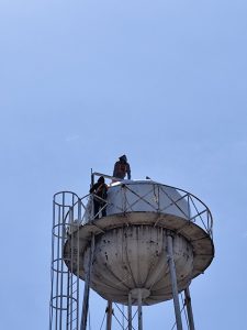En tanque elevado meetálico, raspado y cepillado profundo para eliminar óxido y material deteriorado, así como aplicación de pintura protectora en la estructura y el tanque, prolongando de esta manera su vida útil y garantizando condiciones óptimas de almacenamiento.
