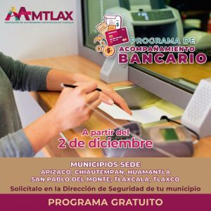 Tlaxcala, Tlax; 05 de diciembre de 2024 (PulsoRed) A través de acuerdos celebrados dentro de la Asociación de Autoridades Municipales de Tlaxcala (AMTLAX), el Ayuntamiento de Tlaxcala de Xicohténcatl se suma al Programa de Acompañamiento Bancario, una iniciativa diseñada para garantizar la seguridad de los ciudadanos al realizar transacciones en sucursales bancarias.