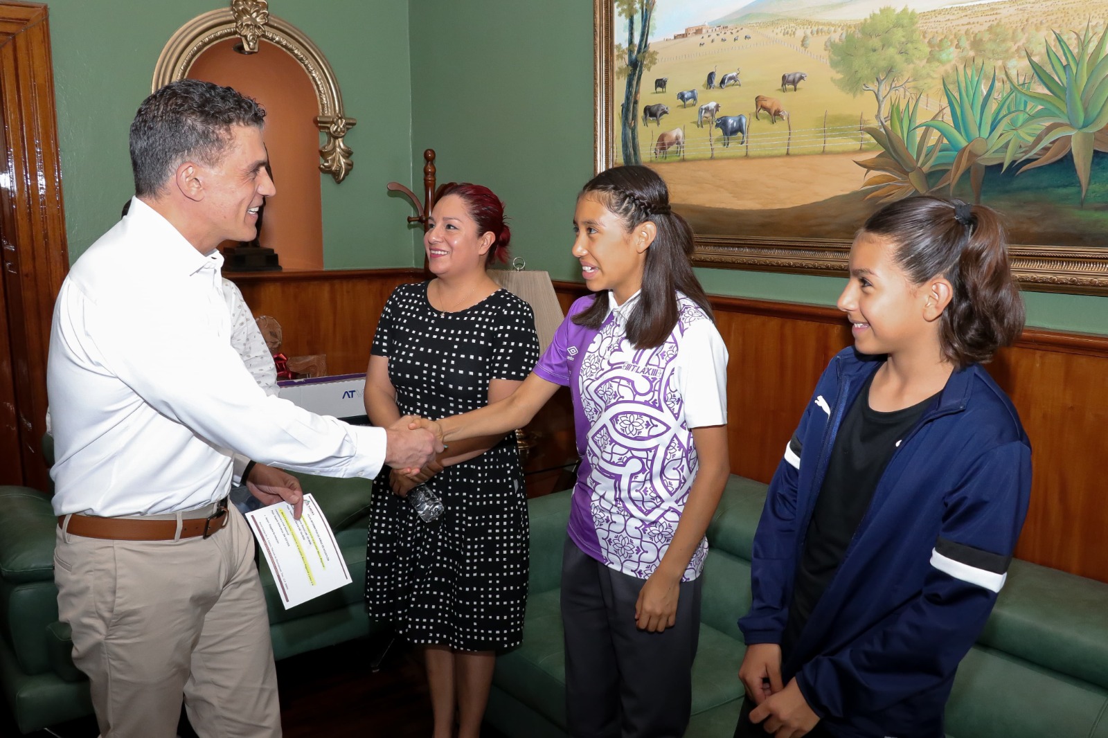 Durante el encuentro con las jóvenes promesas del deporte, realizado en el despacho presidencial, el alcalde felicitó personalmente a las jóvenes deportistas por su destacada participación en la fase estatal y, en particular, reconoció el esfuerzo y la dedicación de la alumna María Fernanda Solís Rodríguez, quien avanza con paso firme en esta justa deportiva.