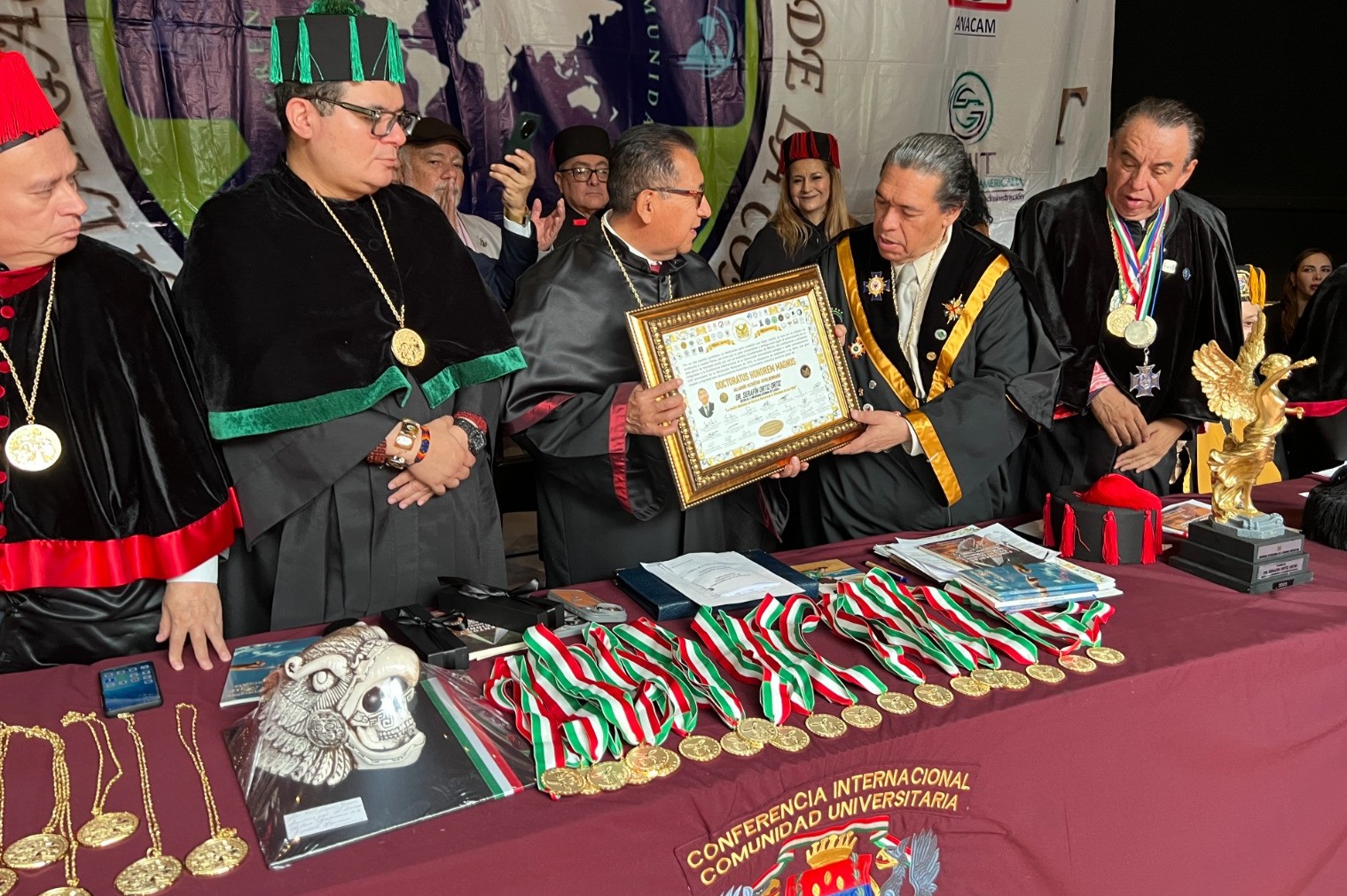 Tlaxcala, Tlax; 01 de diciembre de 2025 (PulsoRed) El Doctor Serafín Ortiz Ortiz, Rector de la Universidad Autónoma de Tlaxcala (UATx), recibió el 𝐆𝐚𝐥𝐚𝐫𝐝𝐨́𝐧 𝐏𝐚𝐭𝐫𝐢𝐨́𝐭𝐢𝐜𝐨 𝐑𝐞𝐯𝐨𝐥𝐮𝐜𝐢𝐨𝐧𝐚𝐫𝐢𝐨 (Doctoratus Honorem Magnus) y la 𝐏𝐫𝐞𝐬𝐞𝐚 𝐑𝐞𝐯𝐨𝐥𝐮𝐜𝐢𝐨́𝐧 𝐌𝐞𝐱𝐢𝐜𝐚𝐧𝐚, distinciones otorgadas por la 𝐂𝐨𝐧𝐟𝐞𝐫𝐞𝐧𝐜𝐢𝐚 𝐈𝐧𝐭𝐞𝐫𝐧𝐚𝐜𝐢𝐨𝐧𝐚𝐥 𝐝𝐞 𝐥𝐚 𝐂𝐨𝐦𝐮𝐧𝐢𝐝𝐚𝐝 𝐔𝐧𝐢𝐯𝐞𝐫𝐬𝐢𝐭𝐚𝐫𝐢𝐚 A.C., que preside el MD Roberto A. Villaseñor Aceves, con motivo del 115 aniversario de la Revolución Mexicana.