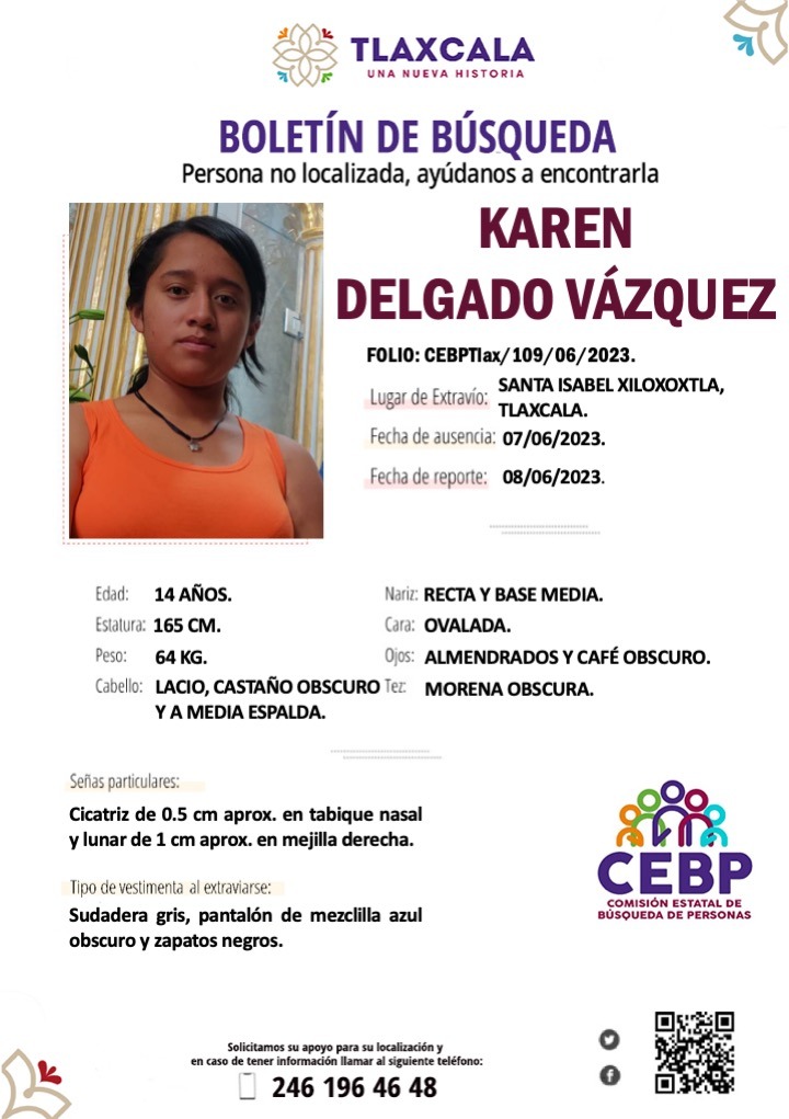 Tlaxcala, Tlax; 8 de junio de 2023 (Selene Sosa) La Comisión Estatal de Búsqueda de Personas en Tlaxcala (CEBPTlax) emitió el boletín de búsqueda de Karen Delgado Vázquez de 14 años de edad, vista por última vez en el municipio de Santa Isabel Xiloxoxtla, Tlaxcala, el pasado 7 de junio de 2023.