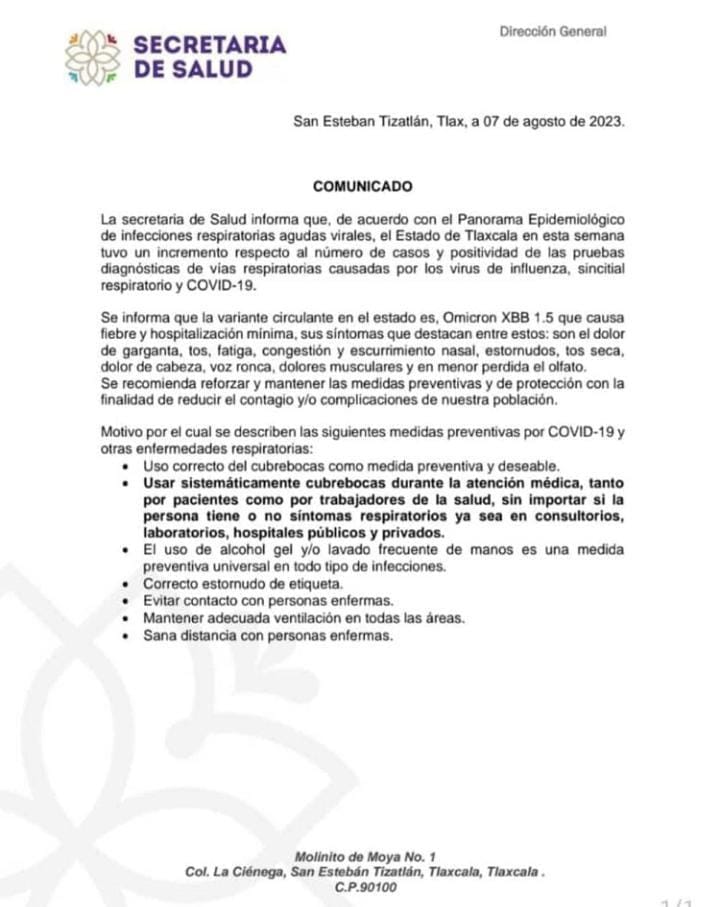Tlaxcala, Tlax; 17 de agosto de 2023 (Selene Sosa) A Tlaxcala regresó el uso de cubrebocas, la sana distancia y la aplicación de alcohol gel, así lo determinó la Secretaría de Salud (SESA), derivado del incremento en la positividad de casos a Covid-9, influenza y sincicial respiratoria.