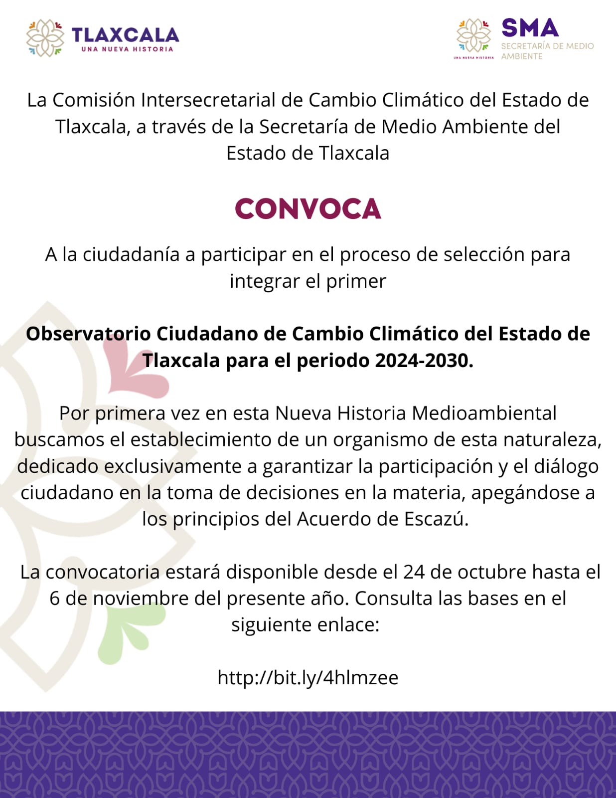 Tlaxcala, Tlax; 26 de octubre de 2024 (PulsoRed) El secretario de Medio Ambiente del estado (SMA), Pedro Aquino Alvarado, en su carácter de secretario Técnico de la Comisión Intersecretarial de Cambio Climático (CICC), invitó a la población tlaxcalteca mayor de edad a participar en la Convocatoria de Proceso de Selección para la Integración del Observatorio Ciudadano de Cambio Climático para el periodo 2024-2030.