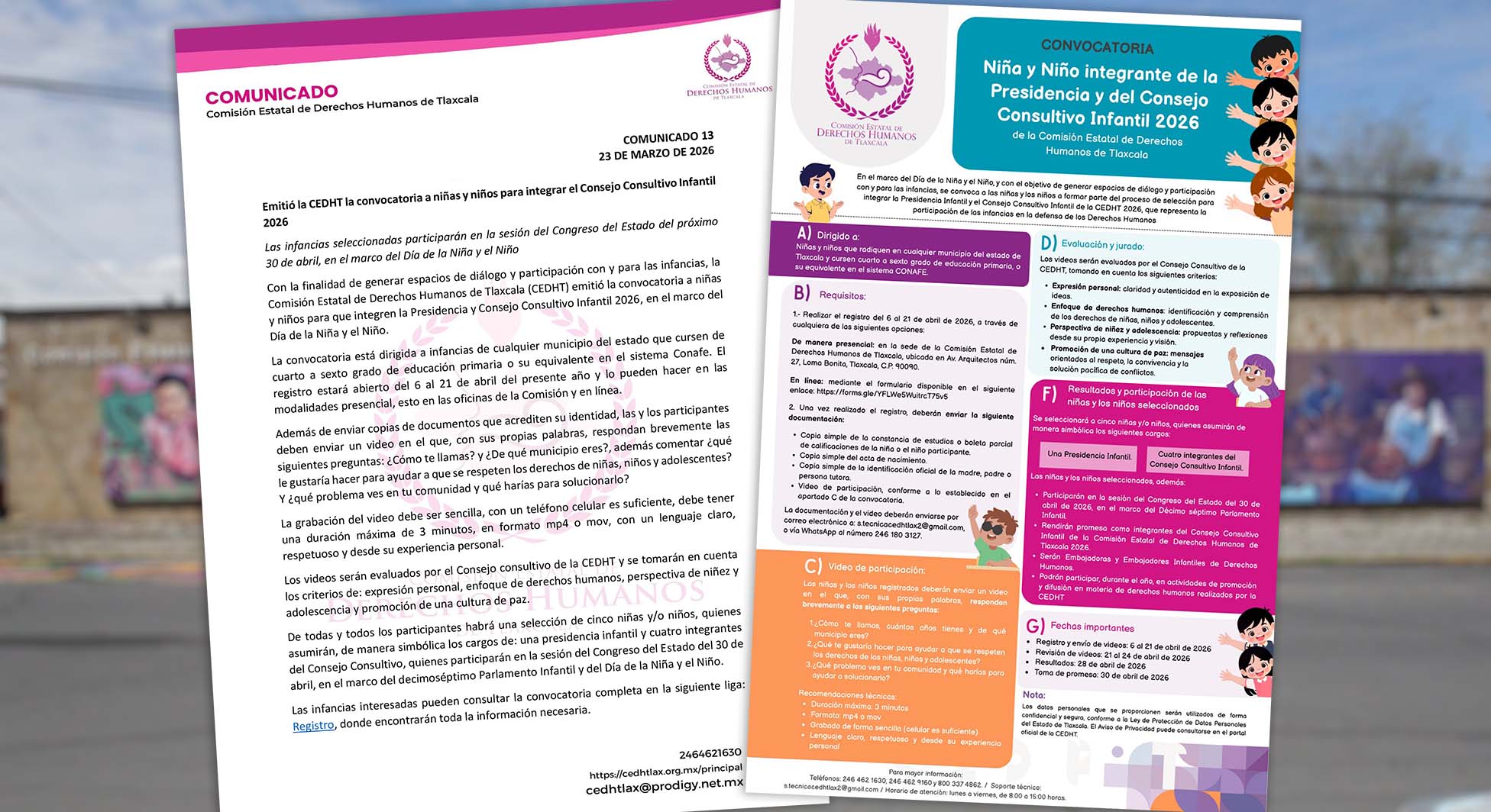 Tlaxcala, Tlax; 24 de marzo de 2026 (PulsoRed) Con la finalidad de generar espacios de diálogo y participación con y para las infancias, la Comisión Estatal de Derechos Humanos de Tlaxcala (CEDHT) emitió la convocatoria a niñas y niños para que integren la Presidencia y Consejo Consultivo Infantil 2026, en el marco del Día de la Niña y el Niño.