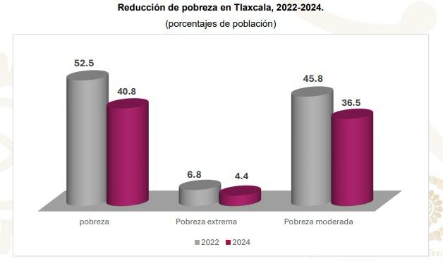 Tlaxcala, Tlax; 13 de agosto de 2025 (PulsoRed) Como resultado de las políticas impulsada por la administración encabezada por la gobernadora Lorena Cuéllar Cisneros, que priorizan el bienestar social, la reducción del rezago y la atención a la marginación, la población en situación de pobreza en el Estado de Tlaxcala disminuyó en 11.7 puntos porcentuales de 2022 a 2024.