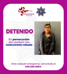 Chiautempan, Tlax; 31 de octubre de 2025 (PulsoRed) Elementos de la Dirección de Seguridad Pública del municipio de Chiautempan lograron la detención de un hombre en la comunidad de Tlalcuapan, luego de una persecución que inició tras detectar una motocicleta con reporte de robo proveniente del municipio de Apizaco.