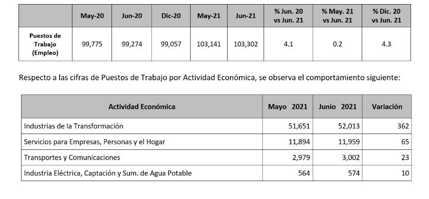 Asimismo, el número de puestos de trabajo al 30 de junio de 2021 es mayor al logrado el 30 de junio de 2020 por 4 mil 028 ya que hace un año el número de trabajadores con seguridad social era de 99 mil 274.