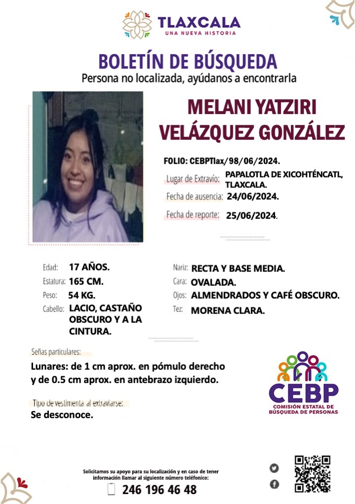 Finalmente, la ficha más reciente de búsqueda emitida por la CEBPTlax es la de Melani Yatziri Velázquez González, de 17 años de edad, quien fue vista por última vez el pasado 24 de junio de 2024 en el municipio de Papalotla, Tlaxcala.