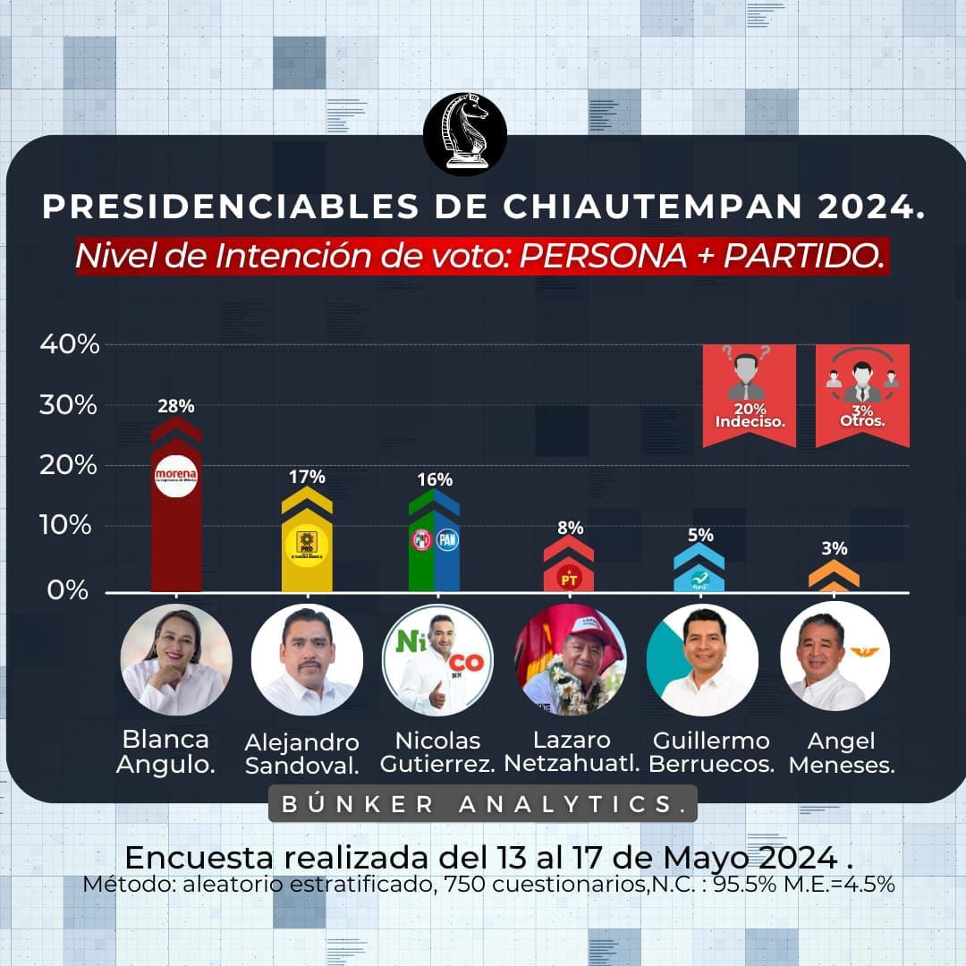 Tlaxcala, Tlax; 17 de mayo de 2024 (Redacción) Blanca Angulo Meneses de Morena encabeza la preferencia electoral en Chiautempan con el 28 por ciento de la intención de voto para presidente municipal, seguida por los candidatos del PRD y del PAN-PRI con 17 y 16 puntos porcentuales, en ese orden.