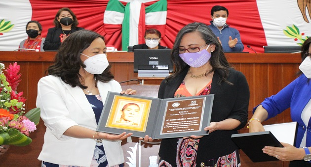 Tlaxcala, Tlax; 8 de marzo de 2021 (Pulso) Integrantes del Pleno de la LXIII Legislatura del Congreso del Estado, entregaron la presea “Natalia Teniza Portillo” a Edith Méndez Ahuaczin, en reconocimiento a su lucha social y actividad profesional en la defensa, protección e investigación de los derechos humanos de las mujeres tlaxcaltecas.