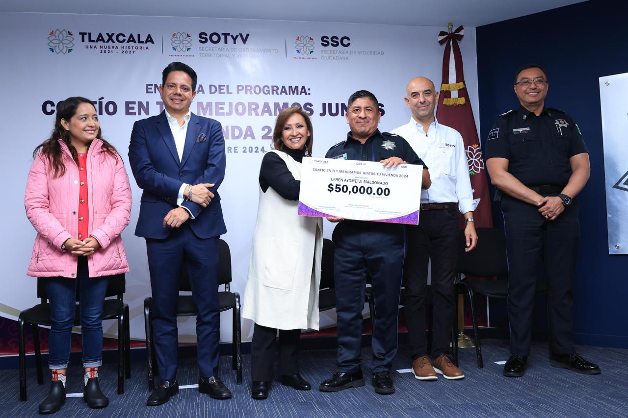 Tlaxcala, Tlax; 27 de septiembre de 2024 (PulsoRed) La gobernadora Lorena Cuéllar Cisneros entregó 100 apoyos del programa “Confío en ti y mejoramos juntos tu vivienda” 2024 a igual número de elementos de la Secretaría de Seguridad Ciudadana (SSC), para garantizar el derecho a una vivienda digna, que les permita mejorar su calidad de vida y la de su familia.