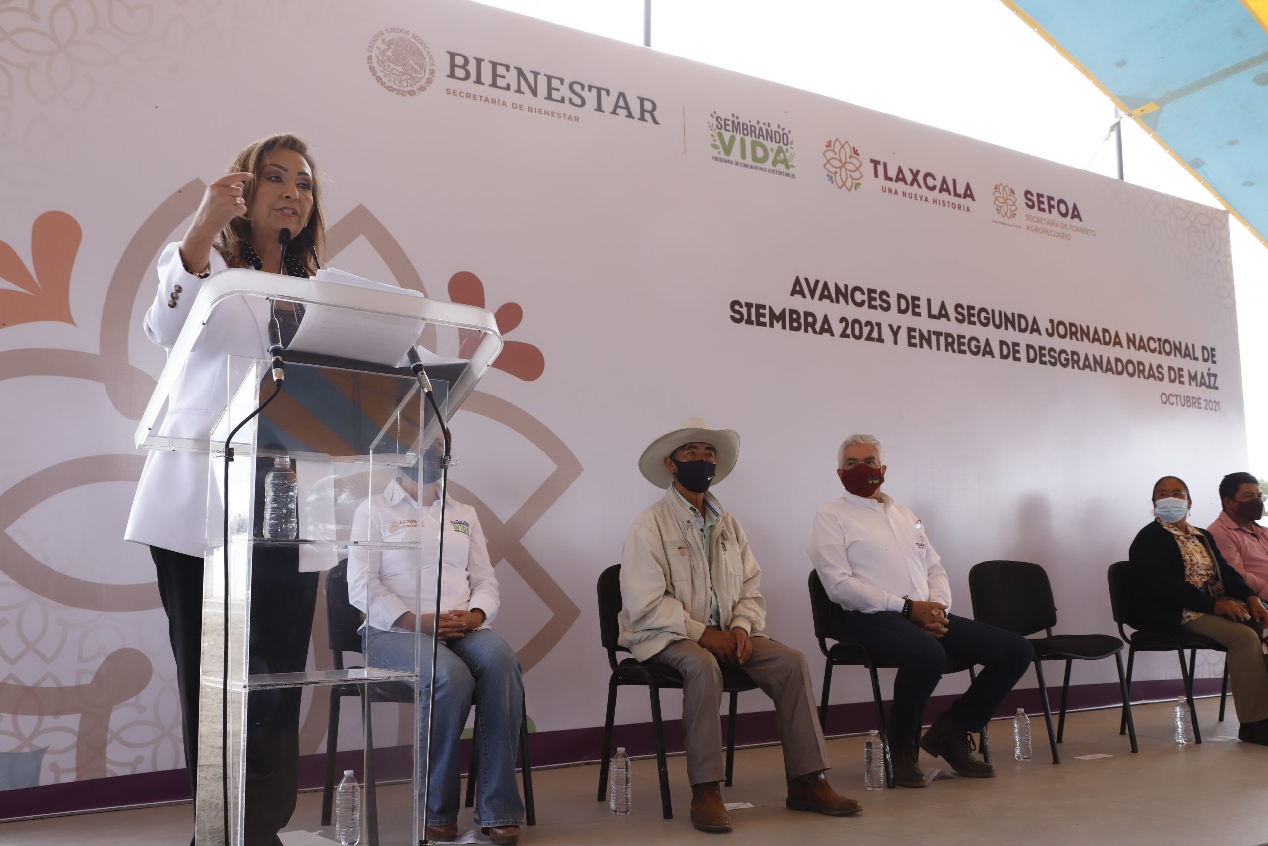 Tlaxcala, Tlax; 6 de octubre de 2021 (Pulso Red) La gobernadora de Tlaxcala, Lorena Cuéllar Cisneros, entregó desgranadoras a cien campesinos y supervisó el avance de la segunda jornada de siembra “Desde el Corazón de Nuestra Tierra” del programa Sembrando Vida, acompañada del delegado de Bienestar, Carlos Luna Vázquez.
