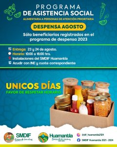Huamantla, Tlax; 23 de agosto de 2023 (PulsoRed)El Sistema Municipal para el Desarrollo Integral de la Familia Huamantla (SMDIF) informa a las y los beneficiarios del Programa de Asistencia Social Alimentaria a Personas de Atención Prioritaria, que se hará la entrega de despensas correspondientes a este mes, los días 23 y 24 de agosto en sus instalaciones ubicadas en Bulevar Fernando Hernández Carrasco #101.
