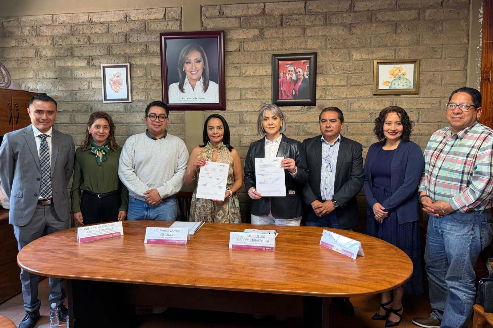 Asimismo, firmó un convenio de colaboración con el AGHET, dirigido por Mayra Vázquez Velázquez, para reforzar la transparencia y la correcta gestión de los archivos, así como trabajar en materia de capacitación con enfoque de derechos humanos para personas servidoras públicas.