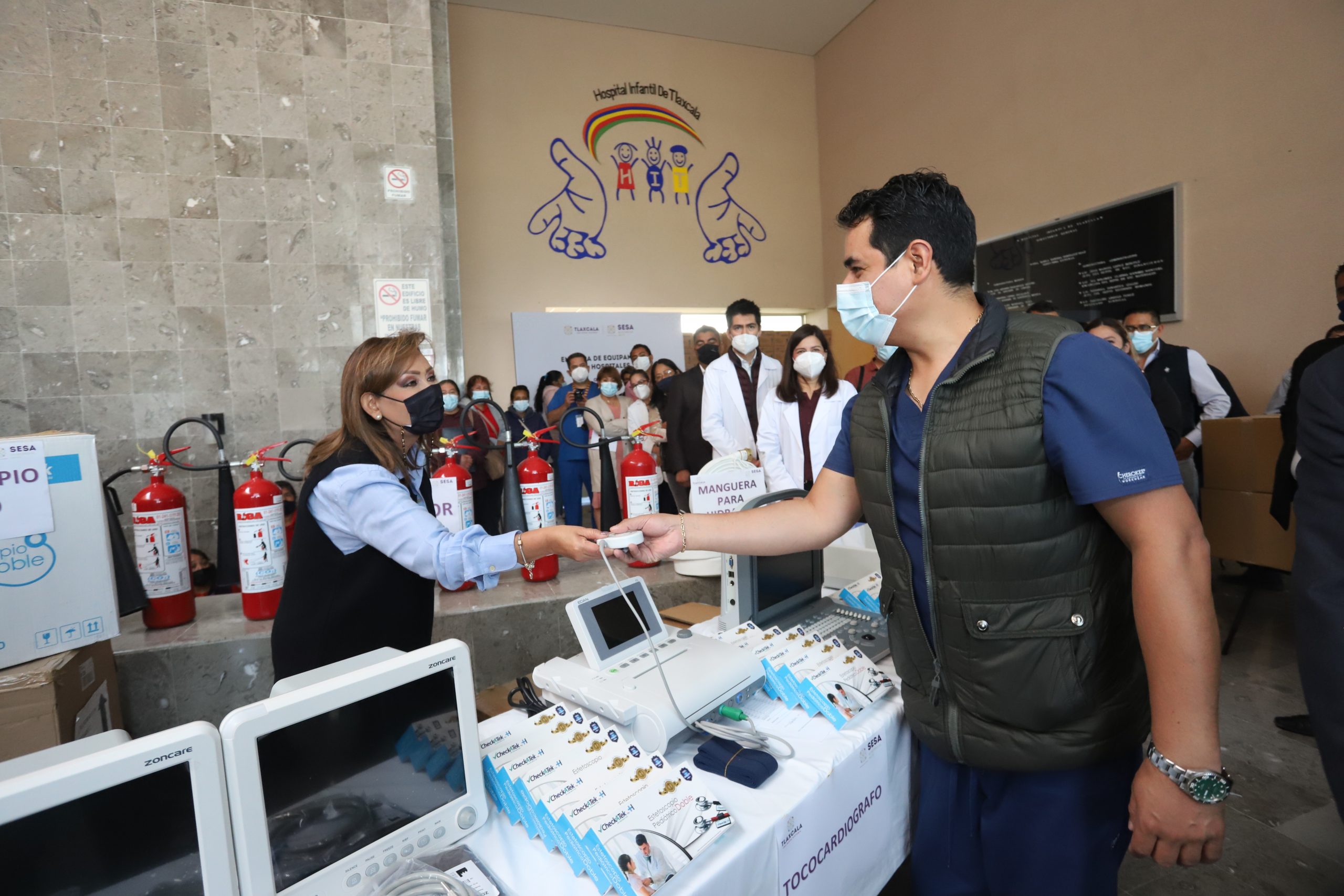 Entregó dos ultrasonidos para los hospitales de Huamantla y de la Mujer, siete tococardiógrafos para los nosocomios de la Mujer, el de Tlaxcala, Huamantla, Nativitas, Calpulalpan, Contla y Tlaxco, así como nueve electrocauterios para los de Nativitas, Tlaxcala, Huamantla, Calpulalpan, Regional de Tzompantepec y HIT, además de sillas para la atención de las personas en las diferentes jurisdicciones, ocho extintores y nueve mangueras de incendio para el de la Mujer.